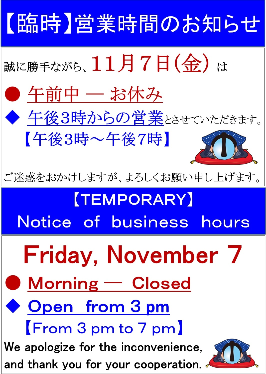 【臨時】2025年11月7日(金)の営業時間のお知らせ